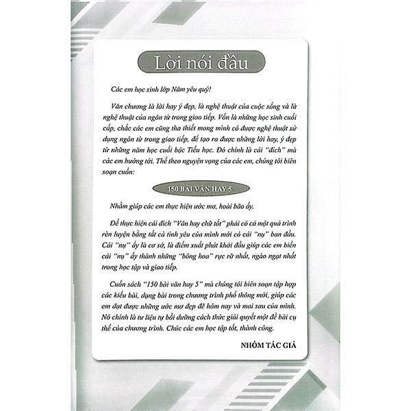Cuốn sách “150 bài văn hay 5” mà chúng tôi biên soạn tập hợp các kiểu bài, dạng bài trong chương trình phổ thông mới, giúp các em đạt được những ước mơ đẹp đẽ hôm nay và mai sau của mình. Nó chính là tư liệu tự bồi dưỡng cách thức giải quyết một đề bài cụ thể của chương trình. Chúc các em học tập tốt, thành công.