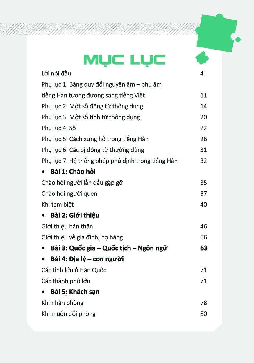 Nhắm đến đối tượng học tiếng Hàn với trình độ bắt đầu và cơ bản, cuốn sách mang đến những kiến thức từ cơ bản nhất như cách chào hỏi, xưng hô, đến những tính huống giao tiếp trong ngữ cảnh cụ thể cách bày tỏ ý kiến, thời tiết, ngân hàng. Đây là những kiến thức nền tảng phục vụ nhu cầu học sâu hơn về sau.