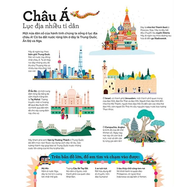 Lần theo ranh giới giữa các lục địa và đại dương; chạm vào dãy núi Himalaya – nóc nhà của thế giới hay sa mạc Sahara – sa mạc nóng lớn nhất thế giới; ghi nhớ vị trí của những địa danh nổi tiếng như tháp đồng hồ Big Ben, Vạn Lí Trường Thành, Kim tự tháp Giza… hoặc tìm kiếm những món quà thất lạc của ông già Noel hay mỏ vàng tại châu Phi! Nào, hãy cùng mở sách và khám phá thế giới cùng Atlas Thế Giới – Tập Bản Đồ Tương Tác ngay thôi!
