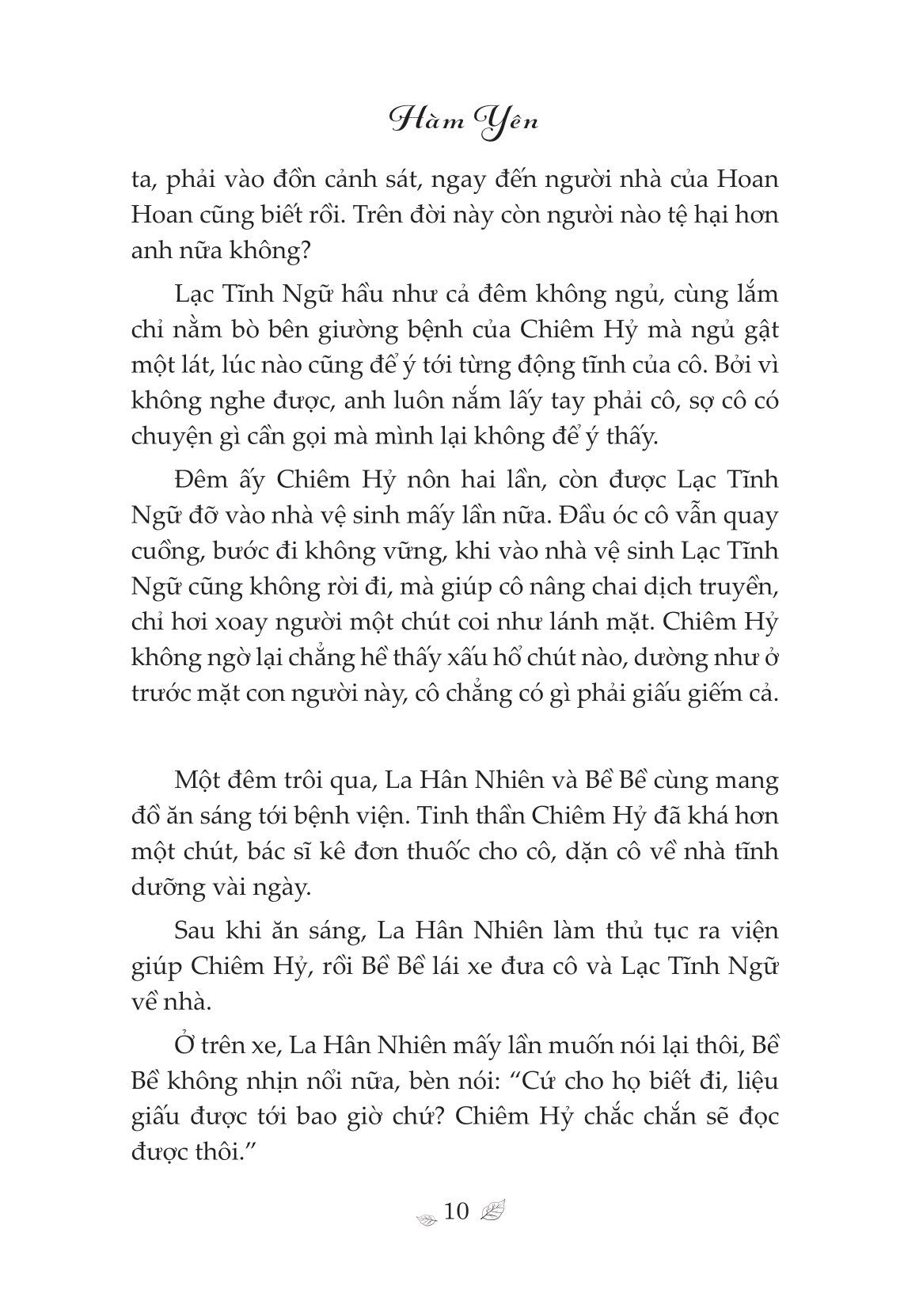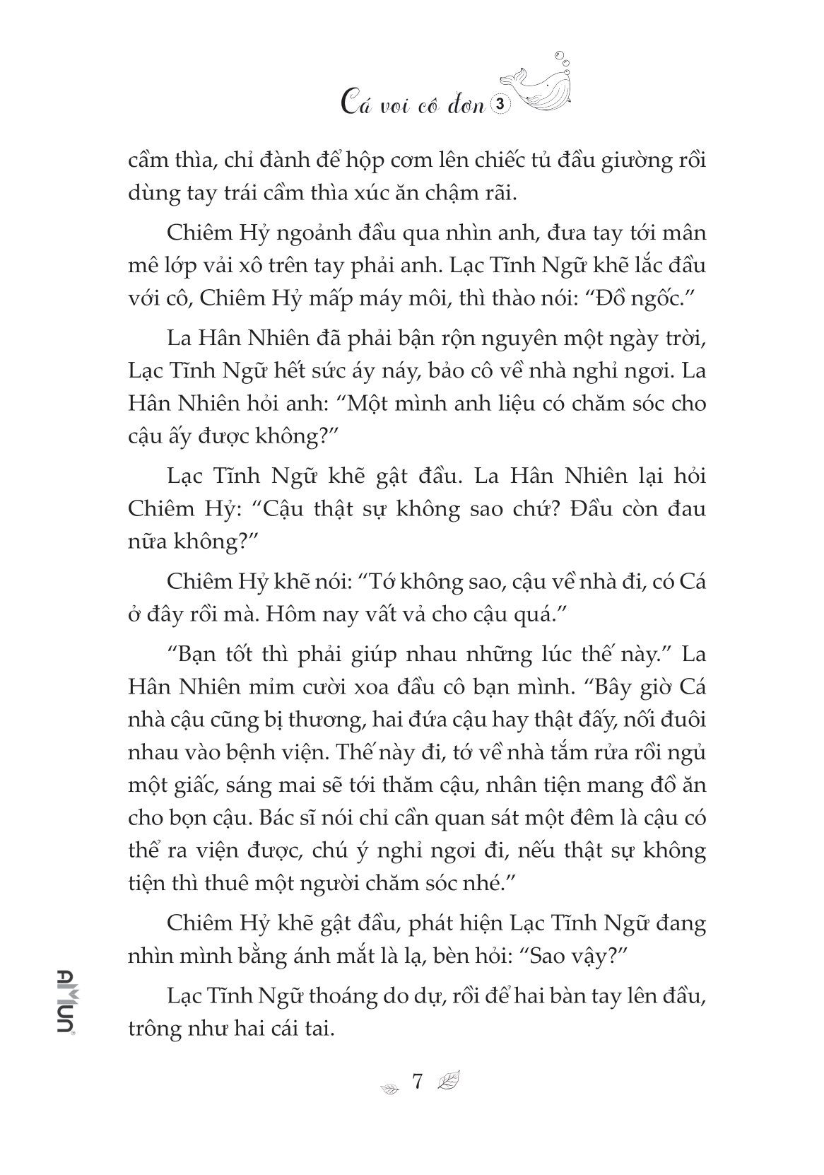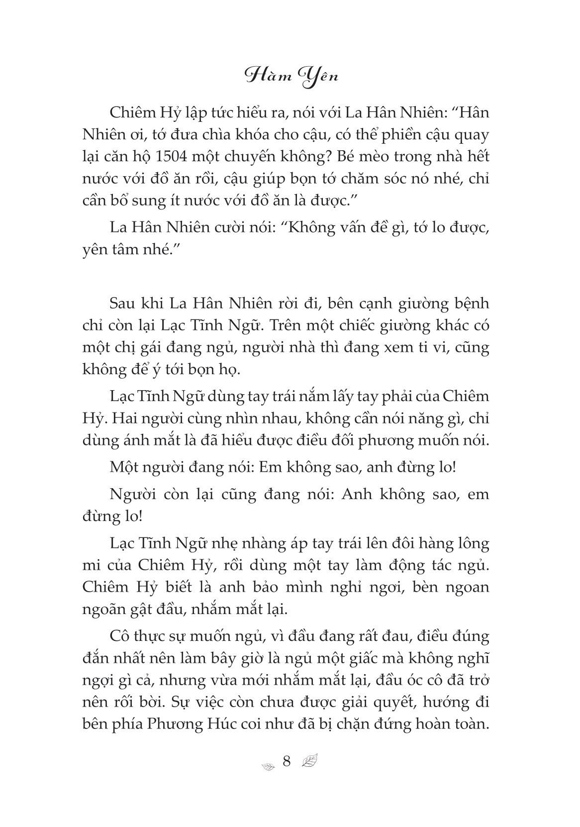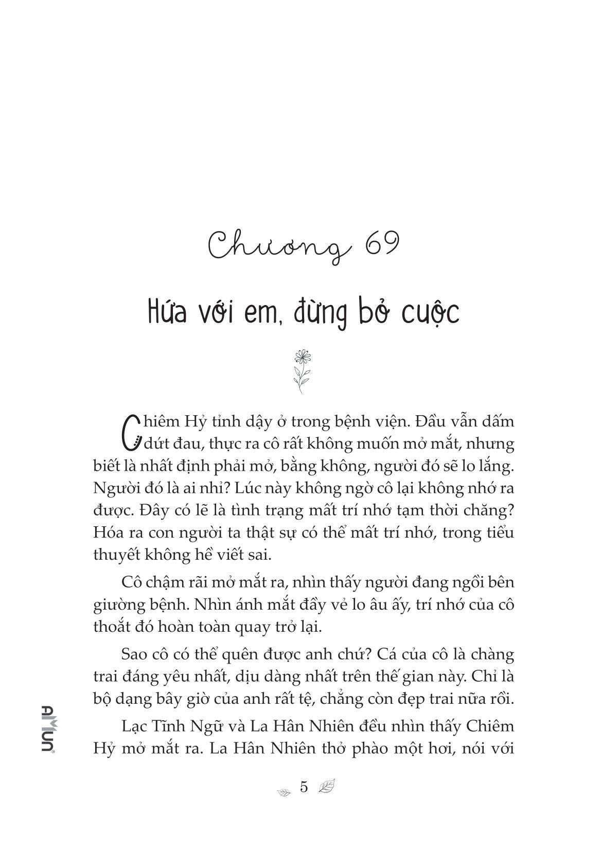 Anh quỳ một chân trước mặt cô, chỉ có ánh lửa đang soi sáng cho bọn họ. Cô nhìn thấy chiếc nhẫn kim cương trong tay anh, nhìn thấy anh hơi hé miệng ra, nghe thấy anh nói lần lượt từng chữ một: “Hoan Hoan, lấy, ánh, nhé, đước, khống?” Mọi người đang chuẩn bị reo hò “đồng ý đi nào”, nhưng người đầu tiên còn chưa kịp bắt nhịp, đại khái ngay lúc Lạc Tĩnh Ngữ vừa mới dứt lời, Chiêm Hỷ đã gật đầu thật mạnh, thế rồi không chút do dự ra dấu bằng thủ ngữ: Em đồng ý, Cá, em muốn làm vợ anh. Anh nghĩ, anh rốt cuộc đã vượt qua được thử thách này rồi, từ nay về sau, cuộc đời của anh sẽ bước sang một trang mới. Anh sẽ trở thành một người chồng, còn có thể trở thành một người cha nữa. Anh nghĩ, cuộc đời này của anh không còn gì nuối tiếc nữa, không nghe được cũng không sao, anh đã hạnh phúc lắm rồi! Anh gặp được một cô gái, cô ấy kéo anh lên từ đáy biển sâu, hai năm nay vẫn luôn bên anh, khích lệ anh, giúp anh hoàn thành ước mơ. Anh muốn tiếp tục được ở bên cô, ở bên cô suốt mấy chục năm đằng đẵng của cuộc đời. Từ nay về sau, anh sẽ không bao giờ cô đơn nữa!