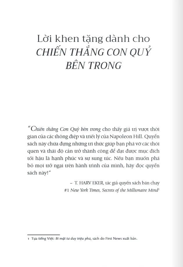 Với văn phong thẳng thắn, trực diện, thâm thúy nhưng đầy thú vị và lôi cuốn, có thể nói “Chiến thắng Con Quỷ bên trong” là cuốn sách dành cho con người trong mọi thời đại. Bởi lẽ, những thông điệp mà Napoleon Hill đúc kết không chỉ đúng với thời đại của ông mà còn vẹn nguyên giá trị cho tới ngày nay, thậm chí là tương lai. Từng lời nói của Con Quỷ như “chỉ điểm” thẳng vào từng ngóc ngách còn lười nhác, dễ dãi, yếu hèn bên trong mỗi chúng ta. Để từ đó, cuốn sách sẽ khơi dậy nguồn cảm hứng và năng lượng cũng như “thổi bùng” ngọn lửa ý chí tự do vốn sẵn có bên trong mỗi người.