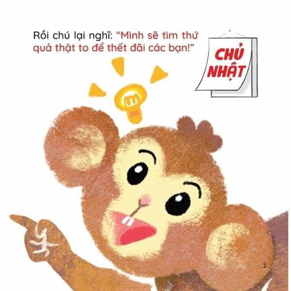 Khỉ con muốn tìm thứ quả thật to để mời các bạn đến nhà dự tiệc. Thế nhưng chú tìm mãi vẫn chẳng biết loại quả nào to nhất khu rừng để chia cho tất cả bạn bè!