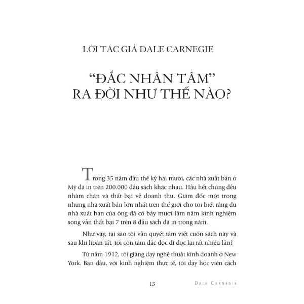Với giọng văn giản dị, cách trình bày gần gũi nhưng cực kỳ khoa học bằng cách đúc rút những điều mối chốt ở cuối chương, Đắc Nhân Tâm là cuốn sách hiếm hoi không kén chọn người đọc. Bất cứ ai cũng có thể đồng cảm. Đây là công trình tâm huyết cả đời của Ngài Dale Carnegie, xuất phát từ chính nhu cầu của Dale khi cảm thấy cuộc đời mình sẽ không phạm phải quá nhiều sai lầm đã qua nếu như được học tử tế về cách cư xử trong cuộc sống. Ông đã viết bằng chính trải nghiệm phong phú cả đời mình. Thậm chí ông còn thuê cả một nhà nghiên cứu chuyên nghiệp để tìm và cùng ông nghiên cứu các tài liệu liên quan. Và cuốn sách hữu ích đến mức vừa ra đời đã phải tái bản liên tục, trở thành hiện tượng chưa từng có trong bối cảnh xuất bản ảm đạm của nước Anh lúc đó. Và mãi đến bây giờ.