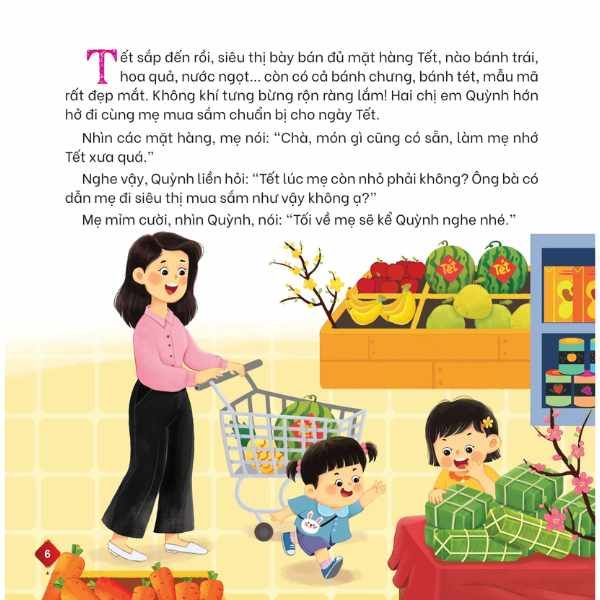 Tết sắp đến rồi, siêu thị bày bán đủ mặt hàng Tết, nào bánh trái, hoa quả, nước ngọt... còn có cả bánh chưng, bánh tét, mẫu mã rất đẹp mắt. Không khí tưng bừng rộn ràng lắm! Hai chị em Quỳnh hớn hở đi cùng mẹ mua sắm chuẩn bị cho ngày Tết.