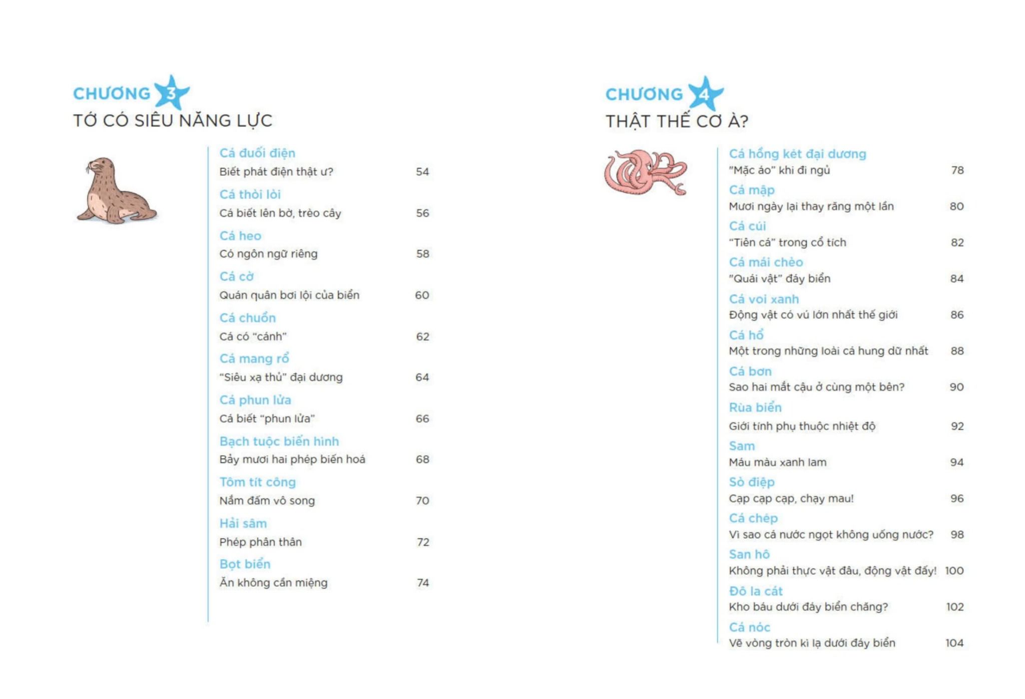 Các bạn nhỏ có biết: Có những loài cá biết phun nước và cả những loài biết “phun lửa”? Chất thải của cá nhà táng thực ra còn quý hơn vàng? Cá nóc có tập tính kì lạ là vẽ vòng tròn dưới đáy biển? Khi bị tấn công, hải sâm thải nội tạng để thoát thân?...