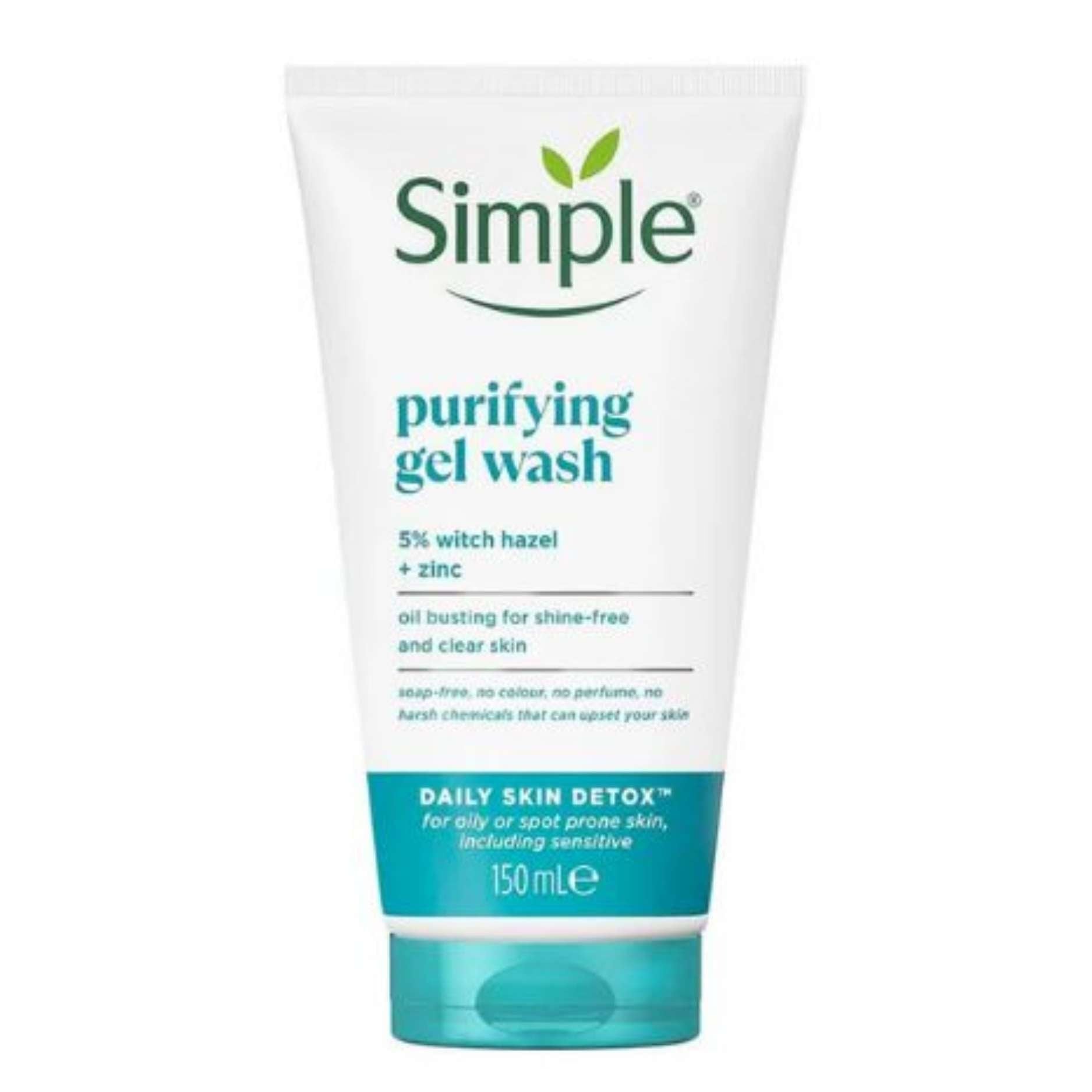 Gel Rửa Mặt Simple Purifying Gel Wash giúp kiềm dầu, ngừa mụn cho da dầu dễ nổi mụn. Sản phẩm với chất gel thanh khiết, chứa chiết xuất Cây Phỉ (Witch Hazel), Kẽm, Prebiotic từ thực vật, Niacinamide (Vitamin B3) sẽ giúp cuốn đi bụi bẩn, tạp chất và dầu thừa, làm sạch da và giảm bóng nhờn, ngừa mụn hiệu quả.