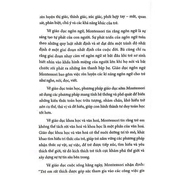 - Về giáo dục khoa học và văn hóa, Monstessori tin rằng ngôn ngữ là sự sáng tạo tự phát của con người. Sự phát triển ngôn ngữ tuân theo những quy luật nhất định và sẽ đạt đến một trình độ nhất định ở một giai đoạn trong cuộc đời. Giáo dục ngôn ngữ Montessori bao gồm việc rèn luyện các kĩ năng ngôn ngữ cho trẻ như: nghe, nói, đọc, viết.