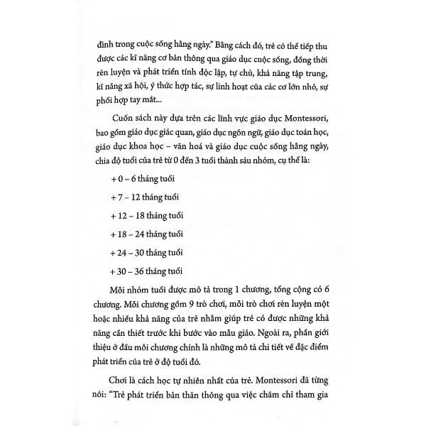 Cuốn sách này dựa trên các lĩnh vực giáo dục Montessori, bao gồm các giáo dục giác quan, giáo dục ngôn ngữ, giáo dục toán học, giáo dục khoa học - văn hóa và giáo dục cuộc sống hàng ngày. chia độ tuổi của trẻ từ 0-3 tuổi thành sáu nhóm: