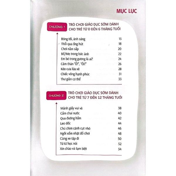 Mỗi nhóm tuổi được mô tả trong 1 chương, tổng cộng có 6 chương. Mỗi chương gồm 9 trò chơi, mỗi trò chơi rèn luyện một hoặc nhiều khả năng của trẻ nhằm ggiusp trẻ có được những khả năng cần thiết trước khi bước vào mẫu giáo.