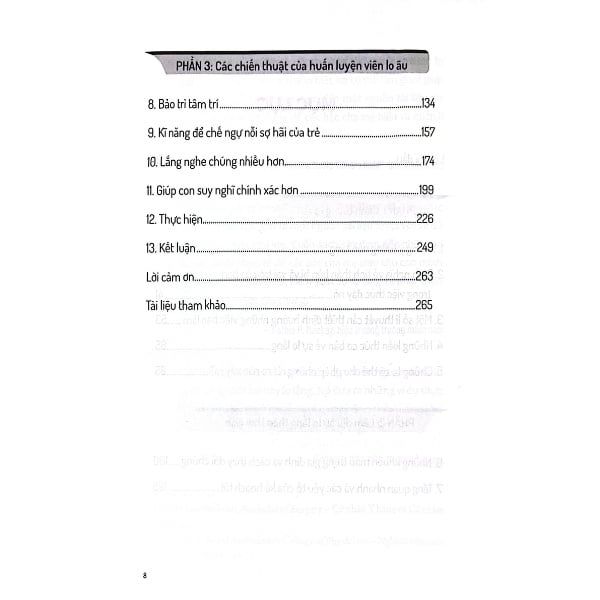 - Phần III (Chương 8 đến 12) xem xét các kĩ thuật đã được chứng minh mà các chuyên gia sức khỏe tâm thần sử dụng để thay đổi hành vi lo lắng trong gia đình, giúp con bạn phát triển sức mạnh cảm xúc ngay cả khi bạn không có mặt.