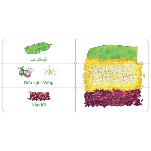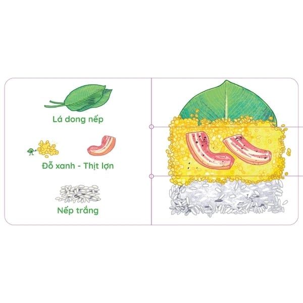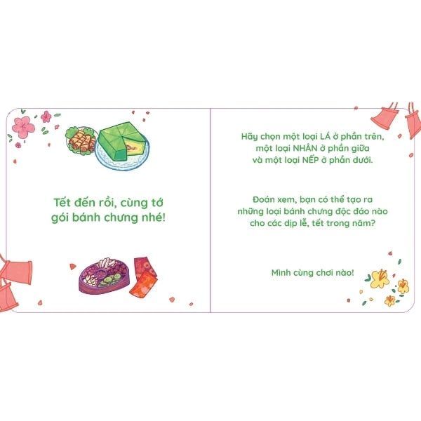 “Gói bánh chưng nào!” là cuốn sách Tết tương tác được in dưới hình thức cartone cứng cáp với các góc được bo tròn an toàn cho bé. Điểm đặc biệt của cuốn sách này là mỗi trang sách được chia thành 3 phần với mỗi phần là các nguyên liệu khác nhau, giúp các em nhỏ có thể lật giở, ghép hình để tạo ra chiếc bánh chưng với nguyên liệu độc đáo trong dịp Tết cổ truyền. Không chỉ cho bé các phút giây bận rộn trong dịp Tết, cuốn sách tương tác độc đáo này còn giúp các em nhỏ ghi nhớ các nguyên liệu làm bánh chưng truyền thống của Việt Nam.