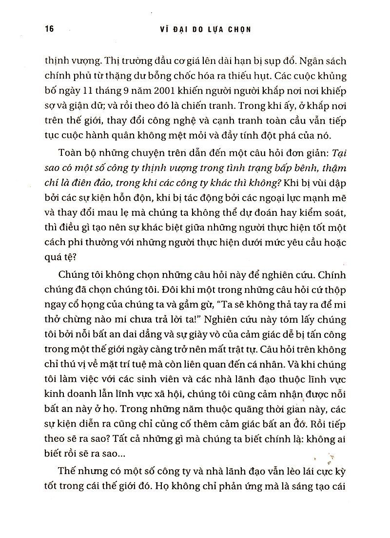 Jim Collins là tác giả của hai đầu sách nổi tiếng - Từ tốt đến vĩ đại và Xây dựng để trường tồn. Cùng với phương pháp nghiên cứu như hai cuốn đầu tiên, trong quyển sách này, Jim Collins cùng với Morten T. Hansen đi tìm câu trả lời cho câu hỏi, tại sao các công ty vĩ đại vẫn trường tồn trong những lúc khó khăn, hỗn loạn. Qua rất nhiều năm nghiên cứu khoa học từ những công ty và các lãnh đạo hàng đầu, hai tác giả rút ra được kết luận rằng: Chúng tôi không tin cuộc sống sẽ trở nên tốt đẹp hơn hay có một phép nhiệm mầu và đoán định được tương lai, nhưng có thể nói nhữg tác động phức tạp, toàn cầu hóa và công nghệ đang thúc đẩy thay đổi và càng dễ bị thay đổi hơn bao giờ hết. Chúng tôi cảm thấy trấn tĩnh vì chúng tôi đã hiểu hơn phải có những gì để sống sót, lèo lái và chiến thắng. Theo chúng tôi, trường tồn và tiêu vong phụ thuộc vào những hành động của chúng ta hơn là những gì mà thế giới gây cho chúng ta; và sự vĩ đại không chỉ là một cuộc chinh phục về kinh doanh, nó là cuộc chinh phục của con người.