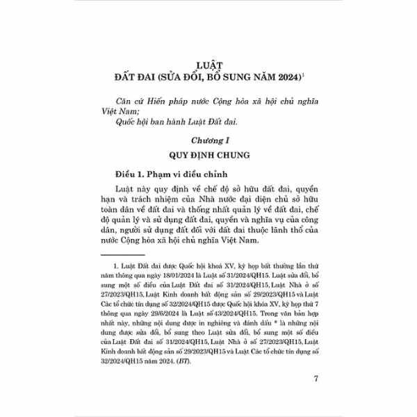 Nhằm giúp bạn đọc trong việc tìm hiểu và thực thi pháp luật về đất đai, Nhà xuất bản Chính trị quốc gia Sự thật xuất bản cuốn sách Luật Đất đai (sửa đổi, bổ sung năm 2024). Cuốn sách là văn bản hợp nhất từ Luật Đất đai năm 2024 và Luật sửa đổi, bổ sung một số điều của Luật Đất đai số 31/2024/QH15, Luật Nhà ở số 27/2023/QH15, Luật Kinh doanh bất động sản số 29/2023/QH15 và Luật Các tổ chức tín dụng số 32/2024/QH15 năm 2024 (những nội dung sửa đổi, bổ sung Luật Đất đai năm 2024).