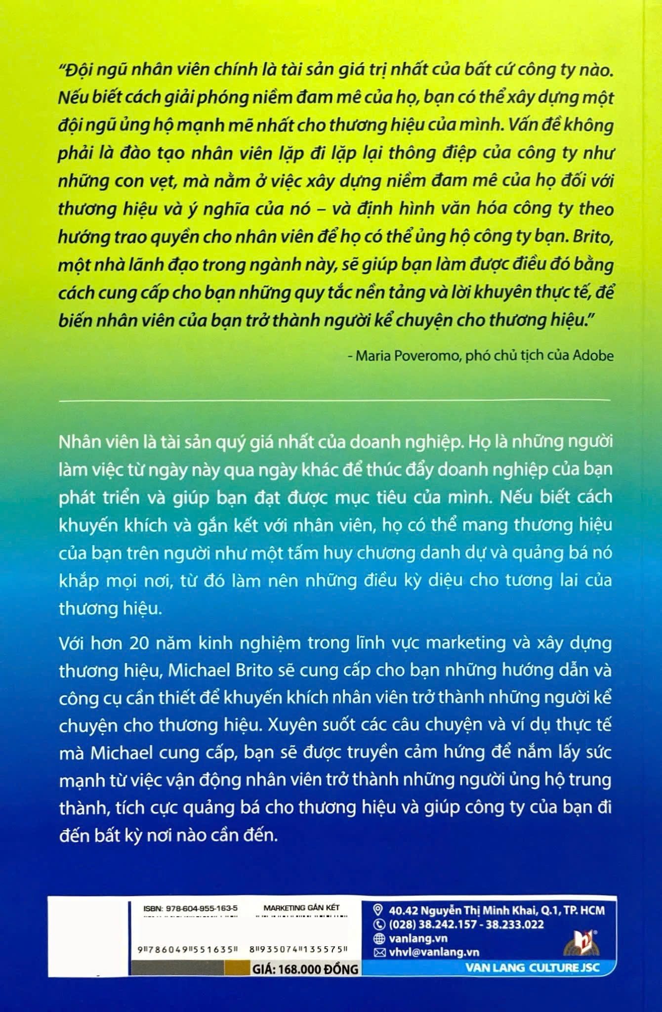 Với hơn 20 năm kinh nghiệm trong lĩnh vực marketing và xây dựng thương hiệu, Michael Brito sẽ cung cấp cho bạn những hướng dẫn và công cụ cần thiết để khuyến khích nhân viên trở thành những người kể chuyện cho thương hiệu. Xuyên suốt các câu chuyện và ví dụ thực tế mà Michael cung cấp, bạn sẽ được truyền cảm hứng để nắm lấy sức mạnh từ việc vận động nhân viên trở thành những người ủng hộ trung thành, tích cực quảng bá cho thương hiệu và giúp công ty của bạn đi đến bất kỳ nơi nào cần đến.