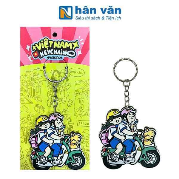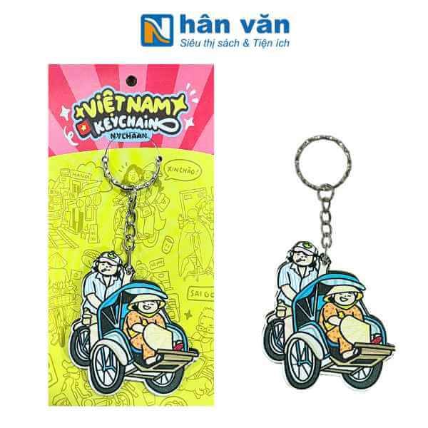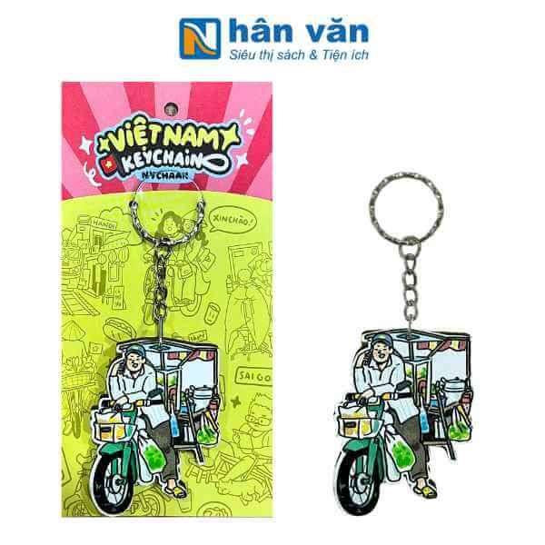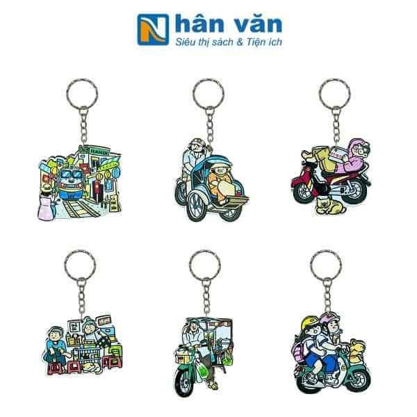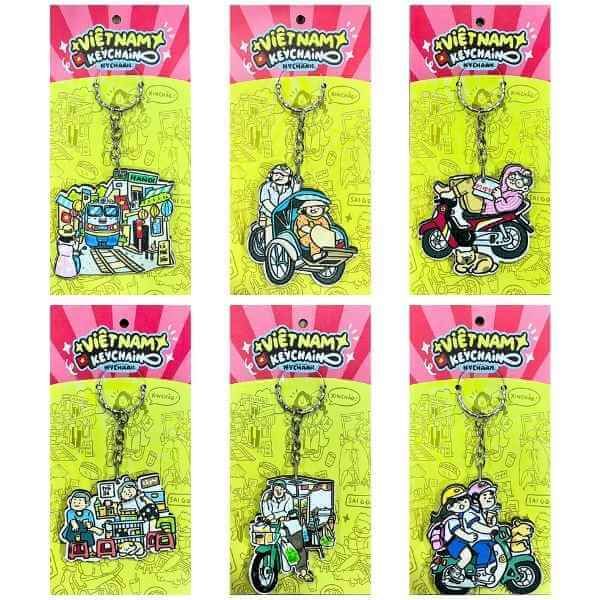 Móc khóa kim loại với các họa tiết "đời thường" được làm bằng chất liệu gỗ, hình ảnh đời thường giản dị tại Việt Nam từ ga tòa, bác xích lô, chú xe ôm, cô hàng nước, chú bán hàng rong đến các em học sinh, hình ảnh thật dung dị đời thường