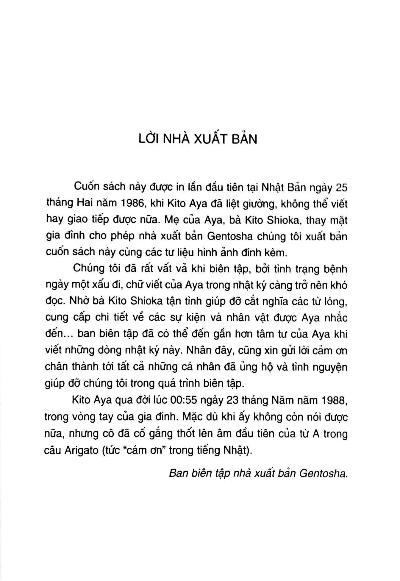Đó là những gì Kito Aya có trong hơn 20 năm cuộc đời. Với Aya, tương lai của cô là một con đường hẹp, và càng ngày nó càng trở nên hẹp hơn. Căn bệnh ngăn trở Aya khỏi tất cả những ước mơ và dự định, thậm chí việc tự mình bước ra ngoài phố để đi tới hiệu sách cũng trở thành một khao khát cháy bỏng. Hơn 6 năm kiên trì viết nhật ký, cô kể về những cảm nhận và suy tư của bản thân trong suốt quãng thời gian chứng kiến cơ thể mình từng bước từng bước gánh lấy một số phận đau đớn . Nhưng từ trong nước mắt và tật nguyền, cuộc tìm kiếm giá trị bản thân của cô đã làm rúng động cả Nhật Bản.