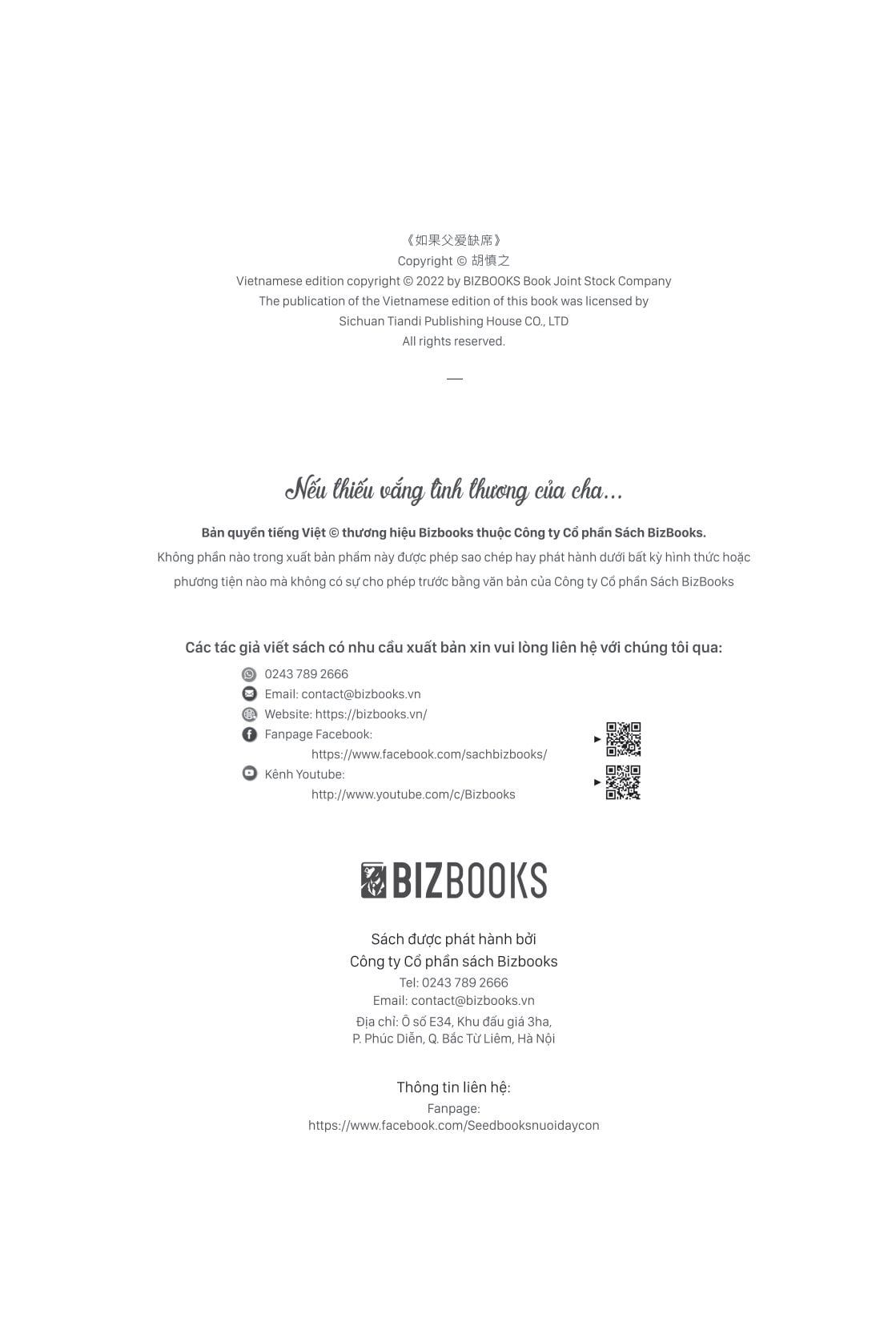 Nếu thiếu vắng tình thương của cha là một cuốn sách nói về “tình cha”. Tác giả muốn dùng kiến thức tâm lý để giúp các ông bố, bà mẹ và cả những đứa trẻ trong gia đình hiểu về “tình cha” cũng như các hành vi liên quan cùng động cơ tâm lý đằng sau tình cảm này. Bizbooks mong rằng qua cuốn sách, tất các các ông bố trên thế giới này đều có thể thực hiện được nguyện vọng của mình và trở thành những người cha như họ mong muốn.