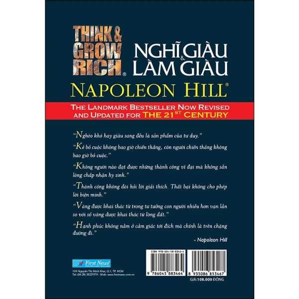 Think and Grow Rich - Nghĩ giàu và Làm giàu là cuốn sách đầu tiên đưa ra triết lý thành đạt - một triết lý đầy đủ và toàn diện về thành công của cá nhân, đồng thời cung cấp cho bạn phương pháp để tạo một ý thức thành công cũng như đưa ra kế hoạch sơ bộ và chi tiết để đạt được thành công đó. Các bí quyết thành công được đề cập đến trong cuốn sách này có thể được đúc kết ngắn gọn: tất cả bắt nguồn từ cách nghĩ. Do đó, cuốn sách này không chỉ thay đổi những điều bạn nghĩ mà còn có thể thay đổi cả cách nghĩ của bạn; không dừng lại ở việc chỉ ra cho bạn thấy bạn phải làm gì mà còn vạch cho bạn biết phải làm điều đó như thế nào để đạt được khát vọng của mình. Ra mắt bạn đọc với phiên bản cao cấp lần này, cuốn sách thay đổi nhiều về hình thức thiết kế bìa cứng, màu nâu đen, chữ vàng ánh kim dập nổi sang trọng, tinh tế