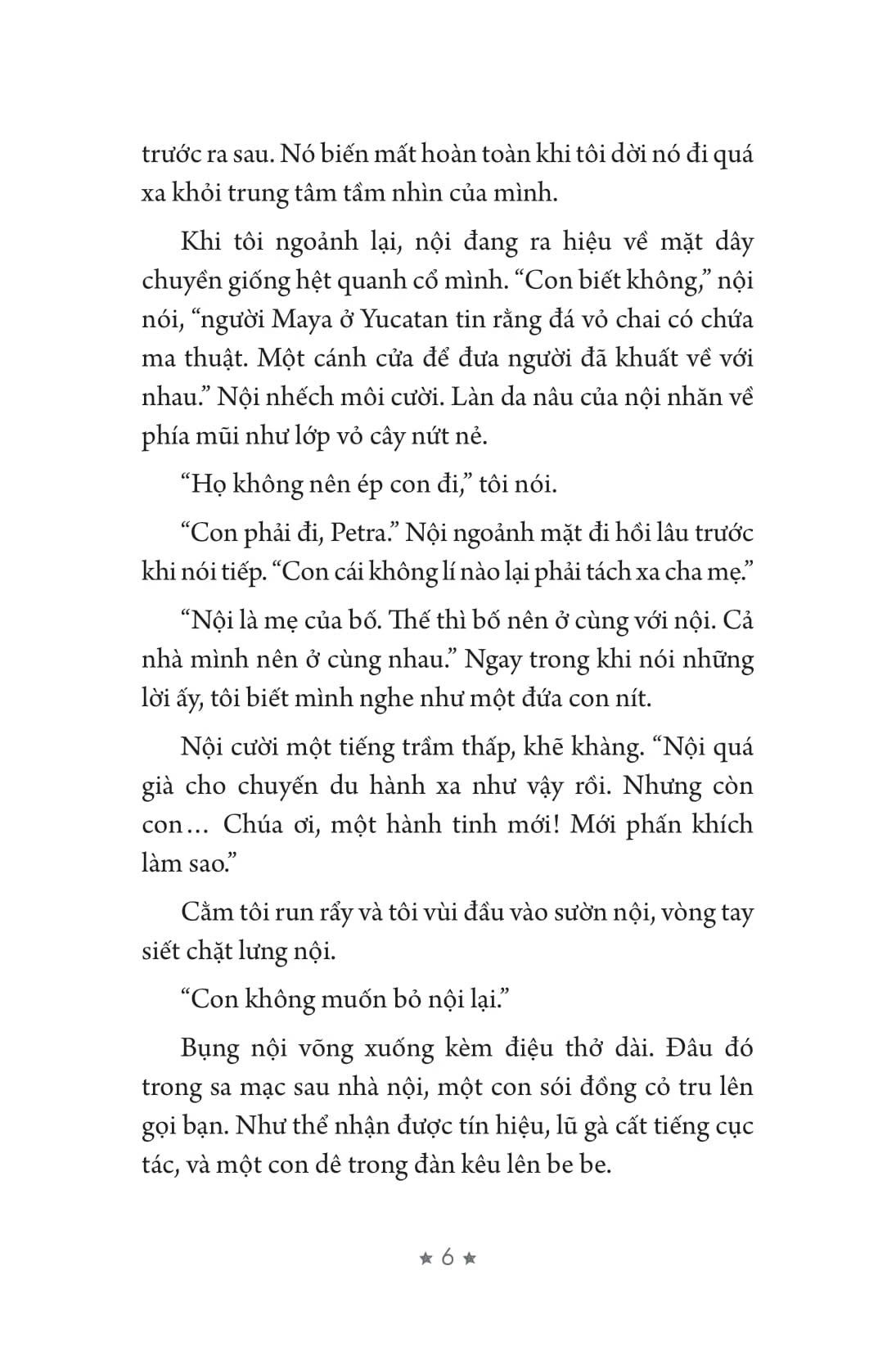 Petra Peña không mong muốn gì hơn là được trở thành người kể chuyện giống như bà nội. Nhưng Trái Đất sắp bị hủy diệt, chỉ vài trăm nhà khoa học cùng con cái của họ - trong số đó có Petra và gia đình cô - được chọn để đến một hành tinh mới. Họ là những người mang trên vai trọng trách nối tiếp cho nhân loại.