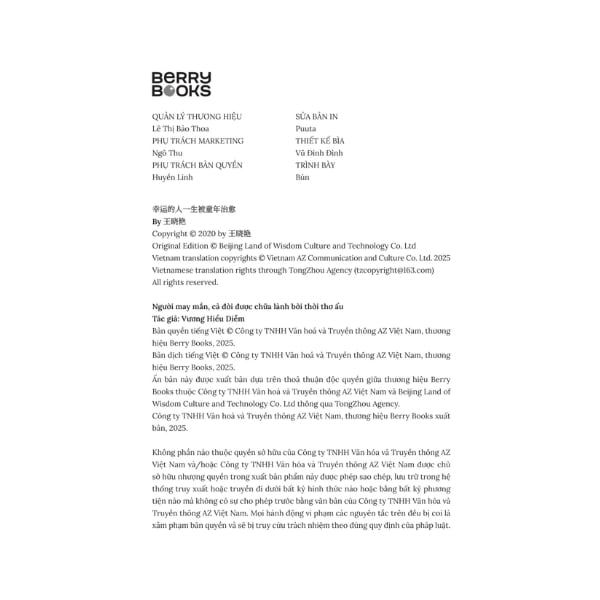 Người may mắn, cả đời được chữa lành bởi thời thơ ấu là hành trình trở về với những năm tháng đầu tiên của tâm hồn nơi mọi niềm tin và nỗi đau hình thành. Dưới góc nhìn của phân tâm học và sự thấu cảm của một người từng đi qua đổ vỡ, tác giả Vương Hiểu Diễm đưa người đọc đi qua từng giai đoạn phát triển tâm lý của con người – từ giai đoạn sơ sinh đến khi trưởng thành – để lý giải vì sao những tổn thương trong tuổi thơ lại ảnh hưởng sâu sắc đến cảm xúc, các mối quan hệ và cách ta nhìn nhận bản thân khi lớn lên. Từ đó, tác giả còn chỉ ra con đường chữa lành nội tâm: chấp nhận, cảm thông và tái kết nối với “đứa trẻ bên trong” mỗi người.