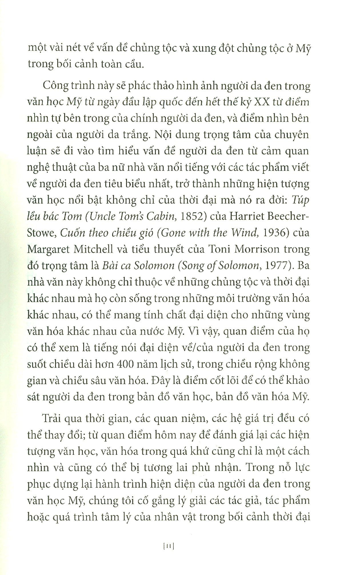 Công trình này sẽ phác thảo hình ảnh người da đen trong văn học Mỹ từ ngày đầu lập quốc đến hết thế kỷ XX từ điểm nhìn tự bên trong của chính người da đen, và điểm nhìn bên ngoài của người da trắng. Nội dung trọng tâm của chuyến luận sẽ đi vào tìm hiểu vấn đề người da đen từ cảm quan nghệ thuật của ba nữ nhà văn nổi tiếng với các tác phẩm viết về người da đen tiêu biểu nhất, trở thành những hiện tượng văn học nổi bật không chỉ của thời đại mà nó ra đời: Túp lều bác Tom (Uncle Toms Cabin, 1852) của Harriet Beecher- Stowe, Cuốn theo chiều gió (Gone with the Wind, 1936) của Margaret Mitchell và tiểu thuyết của Toni Morrison trong đó trọng tâm là Bài ca Solomon (Song of Solomon, 1977). Ba nhà văn này không chỉ thuộc về những sắc tộc và thời đại khác nhau mà họ còn sống trong những môi trường văn hóa khác nhau, có thể mang tính chất đại diện cho những vùng văn hóa khác nhau của nước Mỹ. Vì vậy, quan điểm của họ có thể xem là tiếng nói đại diện về/của người da đen trong suốt chiều dài hơn 400 năm lịch sử, trong chiều rộng không gian và chiều sâu văn hóa. Đây là điểm cốt lõi để có thể khảo sát người da đen trong bản đồ văn học, bản đồ văn hóa Mỹ.