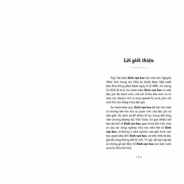 Nhân dịp kỉ niệm 30 năm ra đời bộ sách Kính vạn hoa (1995-2025), chúng tôi cho ra mắt cuốn sách Nguyễn Nhật Ánh và Kính vạn hoa – Chuyện từ A đến Z. Cuốn sách do nhà văn Văn Thành Lê tuyển chọn những bài viết của các nhà văn, nhà thơ, nhà báo, nhà phê bình văn học và cả những độc giả yêu mến Kính vạn hoa suốt 30 năm qua. Đúng như tên gọi, cuốn sách giúp bạn đọc có cái nhìn toàn cảnh về bộ truyện Kính vạn hoa từ ý tưởng khởi thảo, hành trình sáng tác của nhà văn Nguyễn Nhật Ánh, họa sĩ Đỗ Hoàng Tường, cả những lí giải về bí kíp chinh phục bạn đọc của “phù thủy” Nguyễn Nhật Ánh.