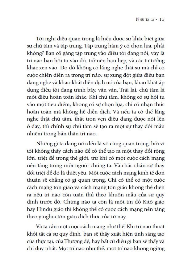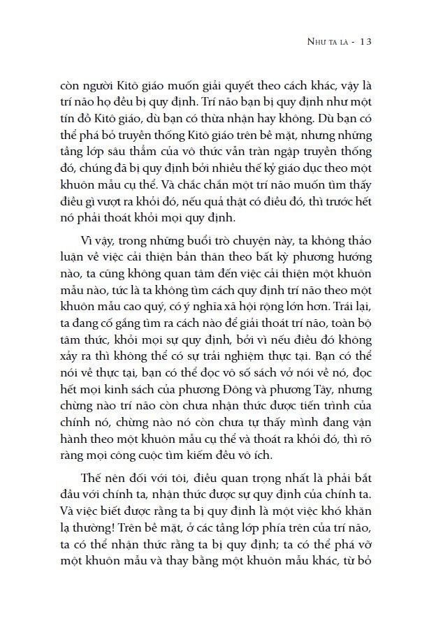 Vậy làm thế nào để tâm trí chúng ta thoát khỏi tất cả sự quy định này? Câu trả lời sẽ được tìm thấy trong quyển sách “Như ta là” (tựa gốc: “As One Is”) của Krishnamurti.