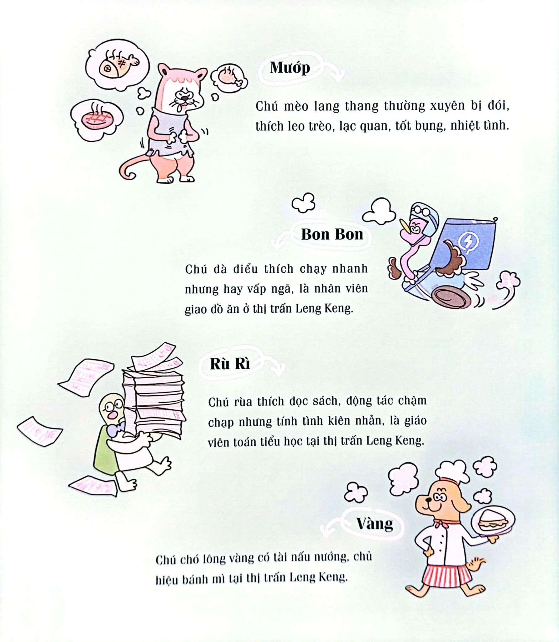Bốn người bạn: Vàng, Rù Rì, Bon Bon và Mướp sẽ dẫn dắt các bé vào những cuộc phiêu lưu thú vị trong thị trấn Leng Keng. Qua đó, các bé sẽ được giải đáp mọi thắc mắc về tiền bạc và hình thành tư duy đúng đắn về tiền.