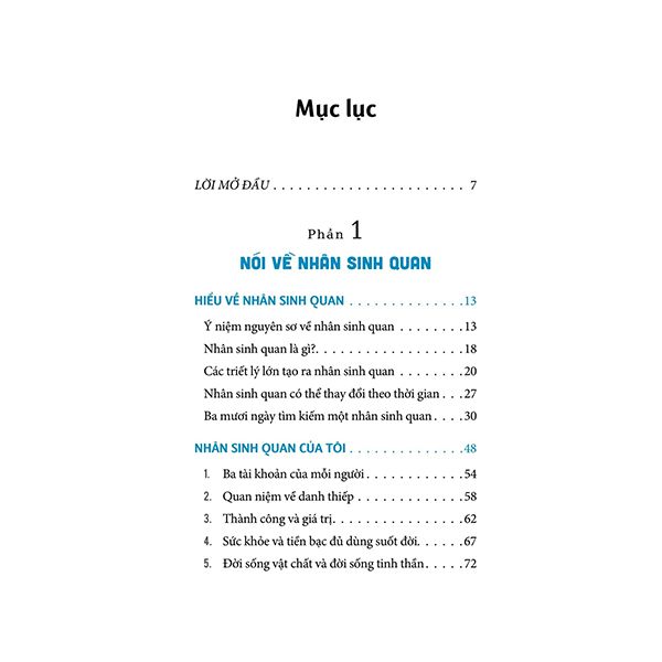 Phần này tập trung vào việc xây dựng và hiểu rõ nhân sinh quan – cách chúng ta nhìn nhận cuộc sống. Qua từng chương, tác giả dẫn dắt độc giả đi từ những ý niệm cơ bản về nhân sinh, triết lý sống, đến việc thực hành cụ thể. Đặc biệt, tác giả giới thiệu hành trình "30 ngày tìm kiếm nhân sinh quan", một lộ trình giúp mỗi cá nhân định hình giá trị sống của mình một cách rõ ràng và sâu sắc.