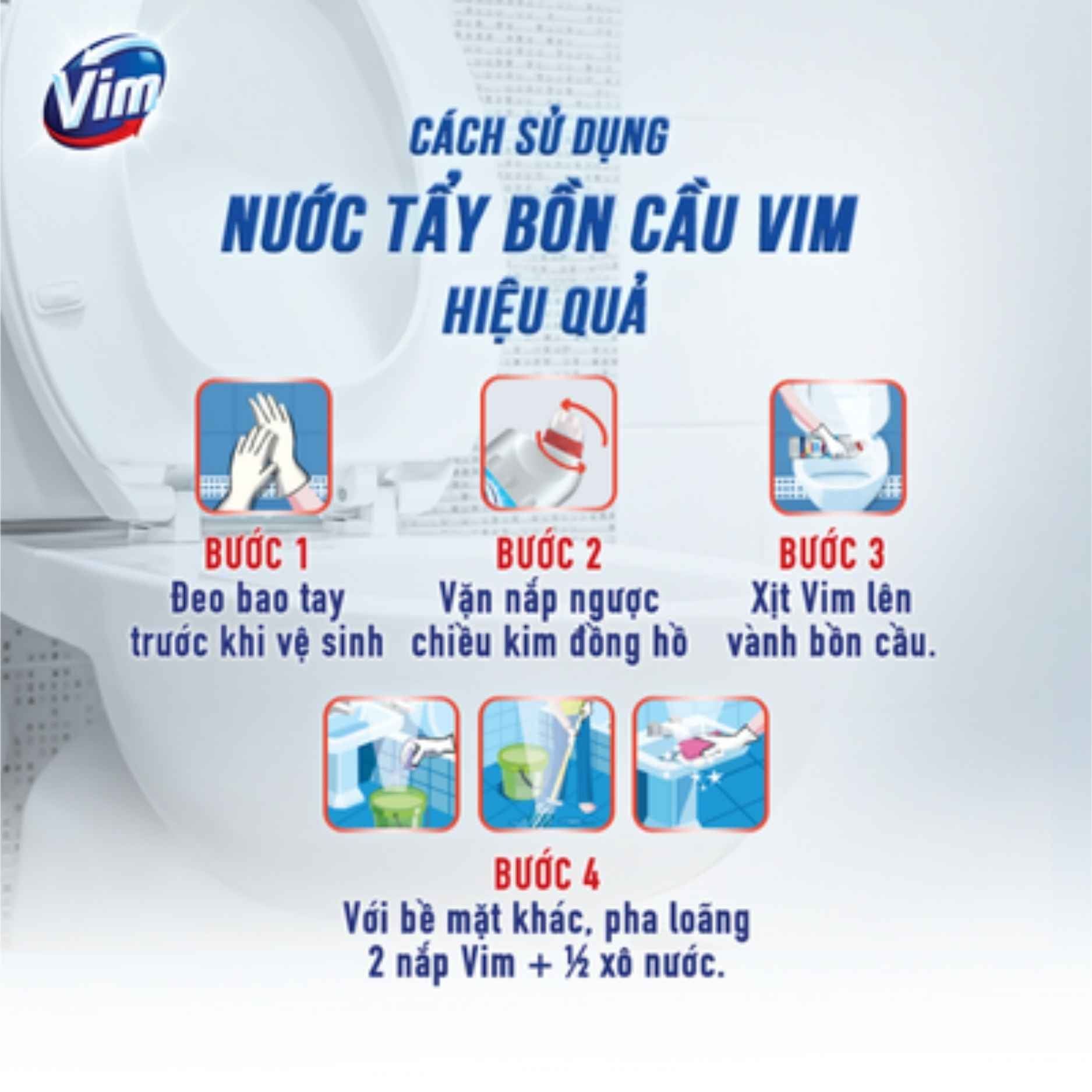Với công thức diệt 99,99% vi khuẩn được kiểm nghiệm và chứng nhận định kỳ tại viện Pasteur thành phố Hồ Chí Minh, Vim là sản phẩm tẩy rửa có công thức đậm đặc giúp diệt sạch vi khuẩn gây bệnh, có khả năng tấn công hoá học vào protein của tế bào vi khuẩn, phá huỷ tế bào và diệt khuẩn hiệu quả, có khả năng diệt cả virus.
