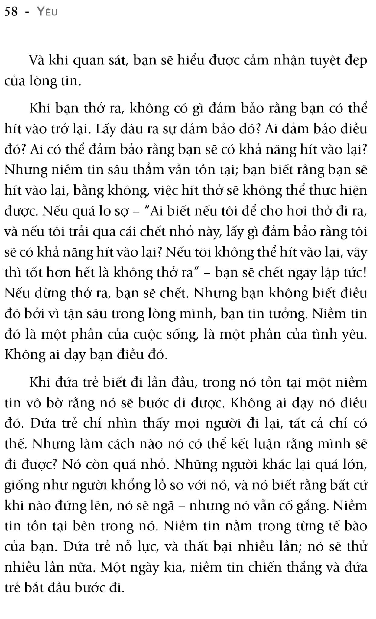 Chúng ta thường sợ hãi khi nghĩ về tình yêu, ta e ngại những nỗi đau lẫn rắc rối mà nó đem đến. Với “Yêu”, bằng giọng văn cá tính và cuốn hút đặc trưng, Osho đem đến sự thấu hiểu trọn vẹn về tình yêu, đồng thời truyền niềm tin và sự dũng cảm để bạn đọc bước vào trải nghiệm phức tạp này một cách mới mẻ trong thứ ánh sáng tỉnh thức của tâm linh. “Tình yêu chỉ có thể trưởng thành trong tình yêu”, ông nói, “Có điều gì đó thật đẹp đang chờ bạn phía trước. Nếu bạn có thể chờ đợi, nếu bạn có đủ kiên nhẫn và có thể tin tưởng, nó sẽ đến”.