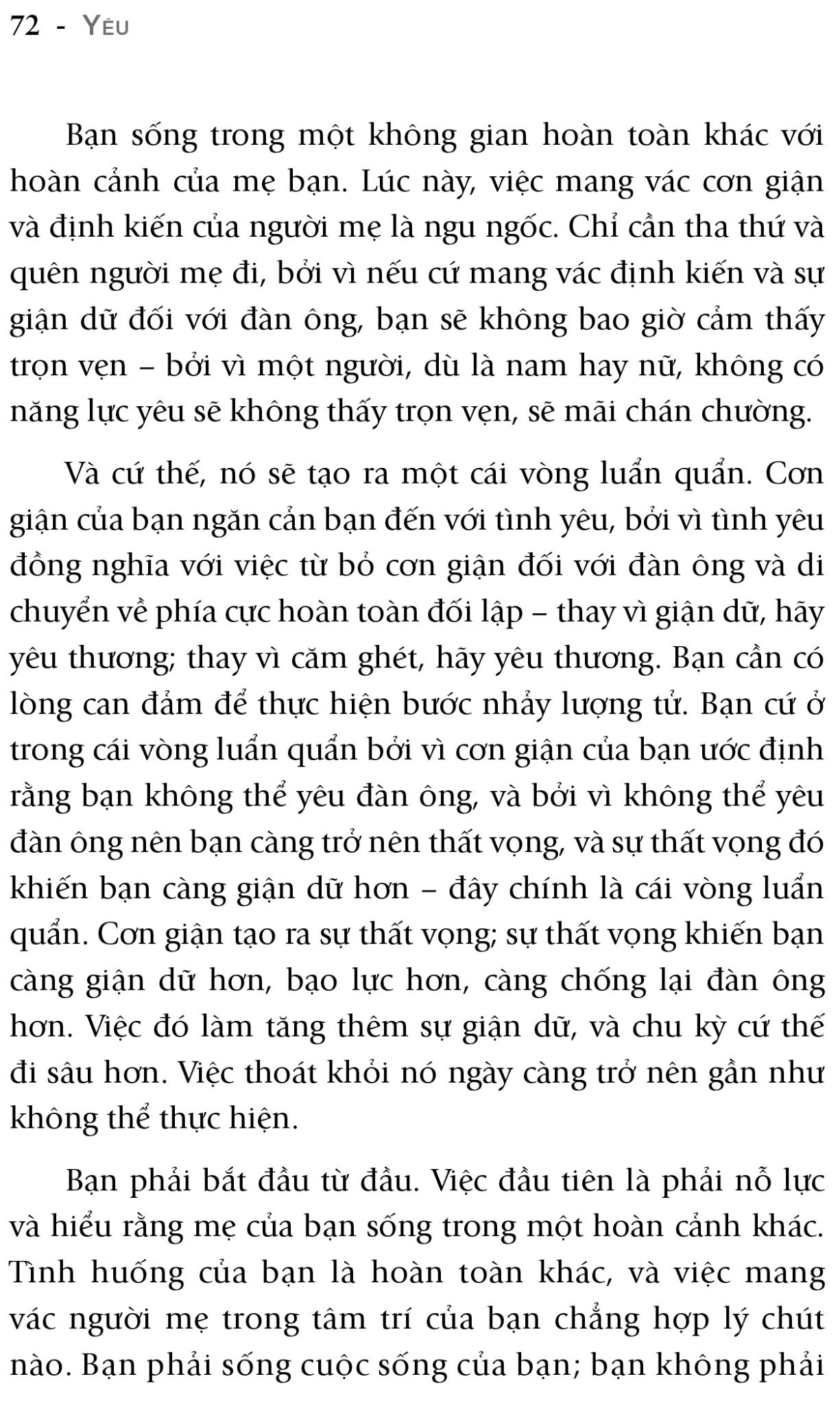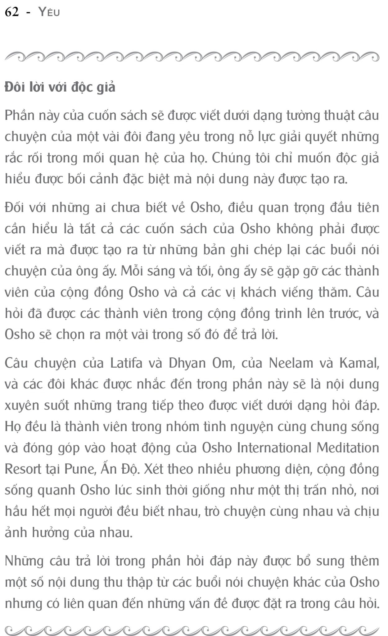 Những người đói khát trong nhu cầu, những người luôn kỳ vọng ở tình yêu chính là những người đau khổ nhất. Hai kẻ đói khát tìm thấy nhau trong một mối quan hệ yêu đương cùng những kỳ vọng người kia sẽ mang đến cho mình thứ mình cần – về cơ bản sẽ nhanh chóng thất vọng về nhau và cùng mang đến ngục tù khổ đau cho nhau. Trong cuốn sách Yêu, Osho - bậc thầy tâm linh, người được tôn vinh là một trong 1000 người kiến tạo của thế kỷ 20 – đã đưa ra những kiến giải sâu sắc về nhu cầu tâm lý có sức mạnh lớn nhất của nhân loại và “chỉ cho chúng ta cách trải nghiệm tình yêu”.