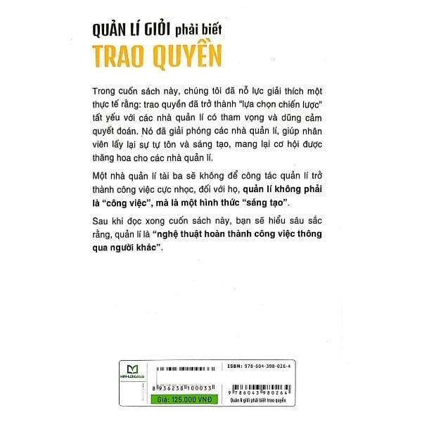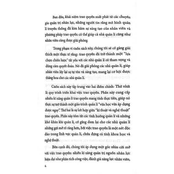 Trong cuốn sách này, chúng tôi đã nỗ lực giải thích một thực tế rằng: trao quyền đã trở thành “lựa chọn chiến lược” tất yếu với các nhà quản lí có tham vọng và dũng cảm quyết đoán. Nó đã giải phóng các nhà quản lí, giúp nhân viên lấy lại sự tự tôn và sáng tạo, mang lại cơ hội được thăng hoa cho các nhà quản lí.