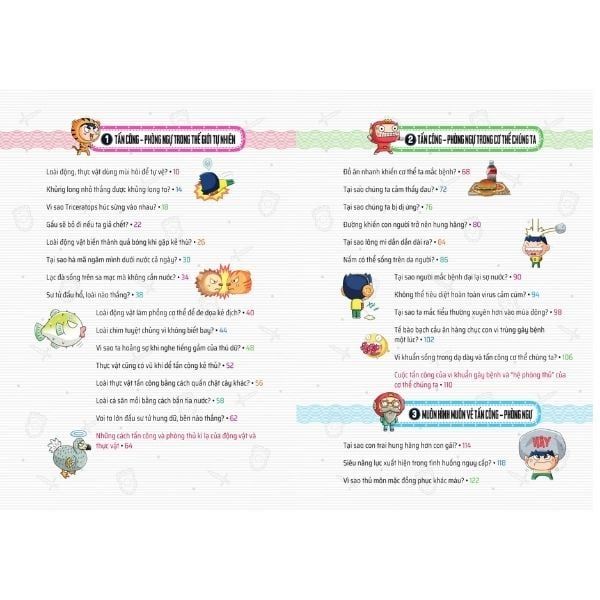 Cuốn sách Quiz! Khoa học kì thú: Tấn công - Phòng ngự này sẽ phần nào giải đáp những câu hỏi tương tự như sau: Khi không may gặp gấu trong rừng, nếu ta giả vờ chết thì liệu con gấu có bỏ đi không? Nếu sư tử và hổ đánh nhau thì con nào sẽ thắng? Tại sao thủ môn lại mặc đồng phục khác màu? v.v… cùng rất nhiều những câu hỏi lí thú khác.