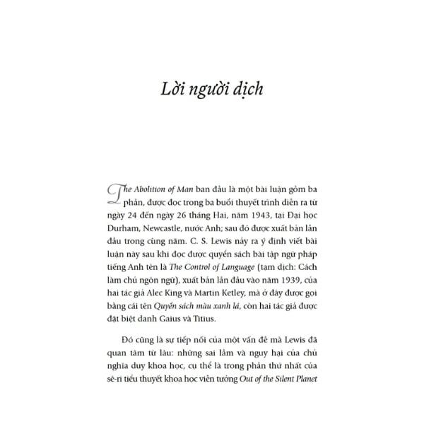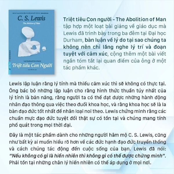 The Abolition of Man tập hợp một loạt bài giảng về giáo dục mà Lewis đã trình bày trong ba đêm tại Đại học Durham, bàn luận về lý do tại sao chúng ta không nên chỉ lắng nghe lý trí và đoạn tuyệt với cảm xúc, cộng thêm một bài viết ngắn tóm tắt lại quan điểm của ông ở một tác phẩm khác. Lewis lập luận rằng lý tính mà thiếu cảm xúc thì sẽ không có thực tại. Ông bác bỏ những lập luận cho rằng hình thức thuần túy nhất của lý tính là bản năng, rằng người ta có thể đạt được những hành động nhân đạo thông qua việc theo đuổi khoa học, và rằng khoa học sẽ là la bàn đạo đức tốt nhất để nhân loại noi theo. Lewis chứng minh rằng các chuẩn mực đạo đức tuyệt đối thật sự có tồn tại và chúng mang tính phổ quát trong mọi thời đại.