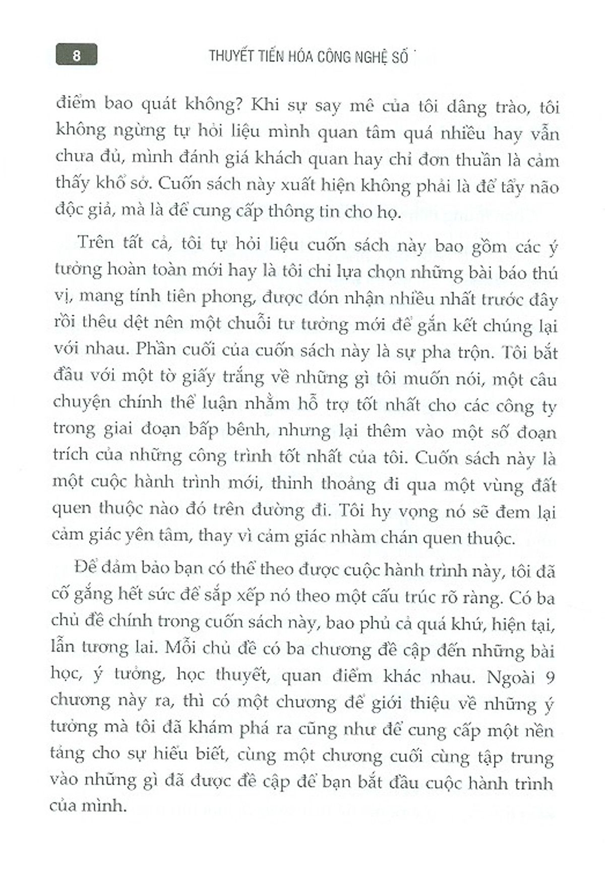 Công nghệ số không phải là một thứ, nó là mọi thứ. Thuyết Tiến Hóa Công Nghệ Số chính là tiếng chuông đánh thức để bạn nhận ra rằng sự thay đổi tích lũy về mặt kỹ thuật số là không đủ. Đối mặt với nhiều công nghệ mang tính cạnh tranh, tốc độ thay đổi chưa từng xảy ra trước đây cùng sự trỗi dậy của những công ty siêu hiện đại đầu tiên, công ty bạn sẽ bị bỏ lại phía sau và sẽ tuyệt chủng nếu bạn không chịu hành động. Cuốn sách này có một cái nhìn rất thú vị về ý tưởng phân rã để truyền cảm hứng cho các công ty muốn trở thành người tốt nhất trong phong trào đổi mới về mặt kỹ thuật số và muốn tồn tại được trong những giai đoạn bất ổn định này.