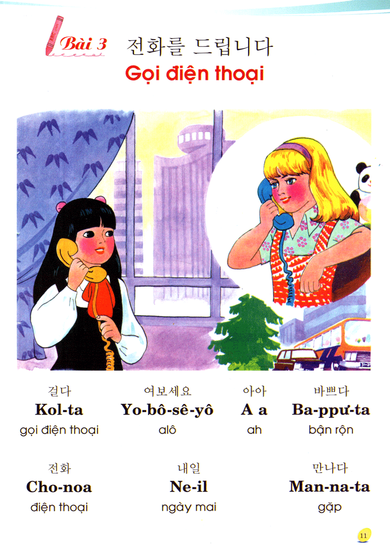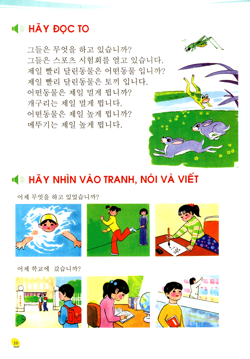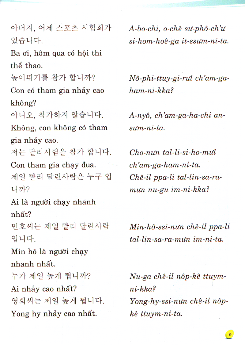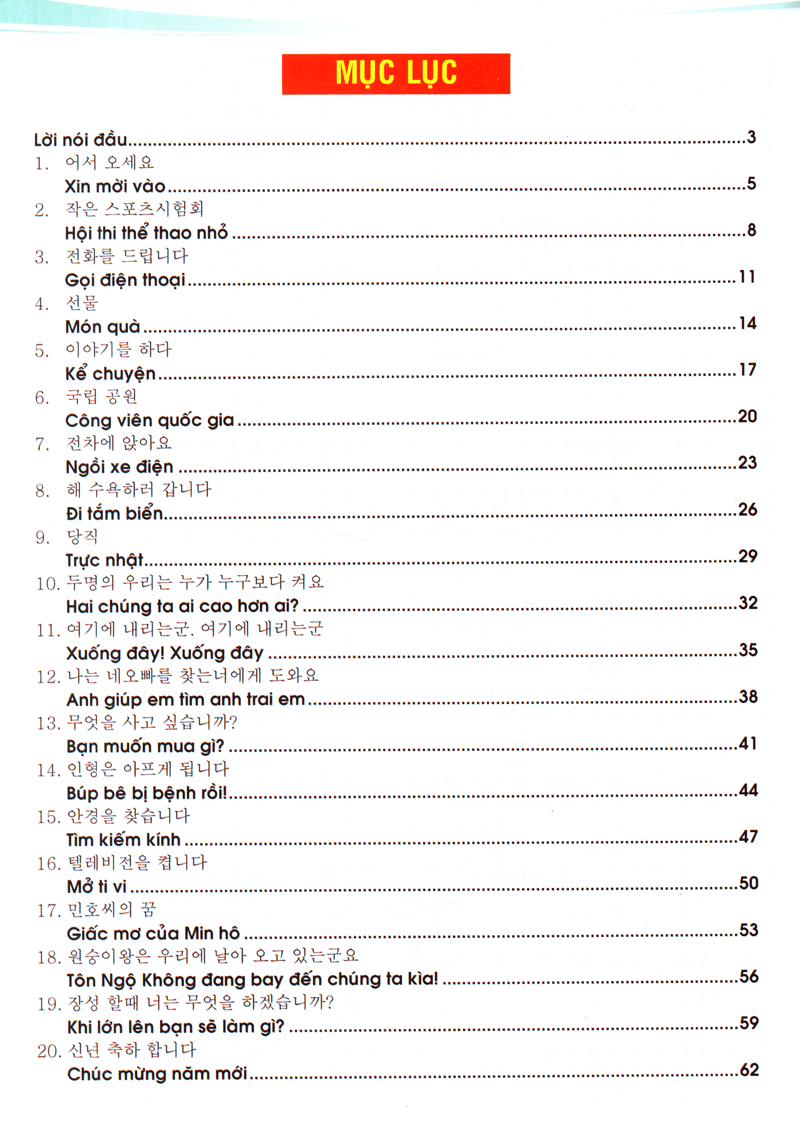 Sách tiếng Hàn dành cho trẻ em tất cả gồm 3 tập, mỗi tập bao gồm hai mươi bài học. Mục tiêu của tập 1 là hướng tới việc dạy trẻ cách phát âm bằng nhiều kỹ năng phát âm khác nhau; tập 2 và tập 3 tập trung chính vào những mẫu câu cơ bản, đơn giản và dễ hiểu dành cho trẻ em. Mỗi tập đều có phần phụ lục tra cứu từ.