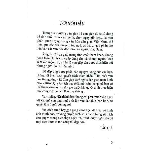 Để đáp ứng được phần nào nguyện vọng của các bạn, chúng tôi biên soạn quyển sách tham khảo "Tìm hiểu văn hóa tín ngưỡng - 12 Con giáp và ý nghĩa dân gian năm Bính Ngọ - 2026". Quyển sách này sẽ là một cẩm nang mà bạn có thể tham khảo xem ngày, giờ trước khi quyết định thực hiện một công việc có nên làm hay không.