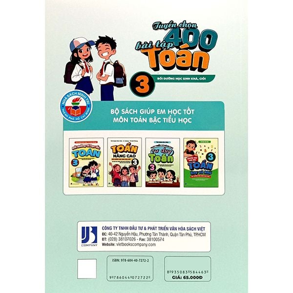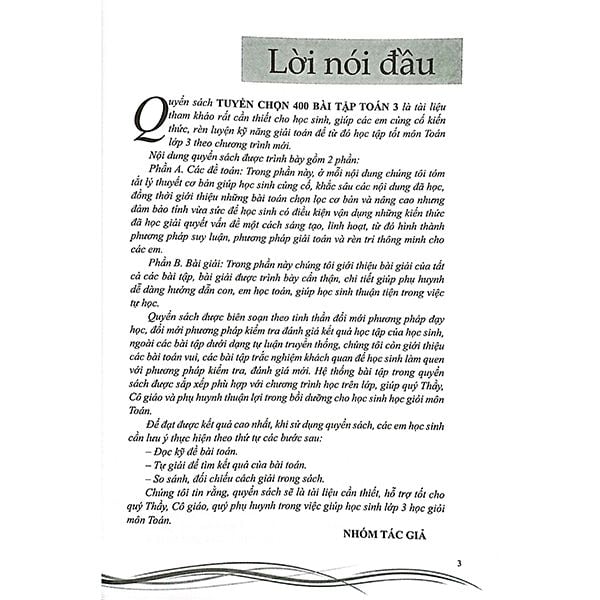 Quyển sách TUYỂN CHỌN 400 BÀI TẬP TOÁN 3 là tài liệu tham khảo rất cần thiết cho học sinh, giúp các em củng cố kiến thức, rèn luyện kỹ năng giải toán để từ đó học tập tốt môn Toán lớp 3 theo chương trình mới.