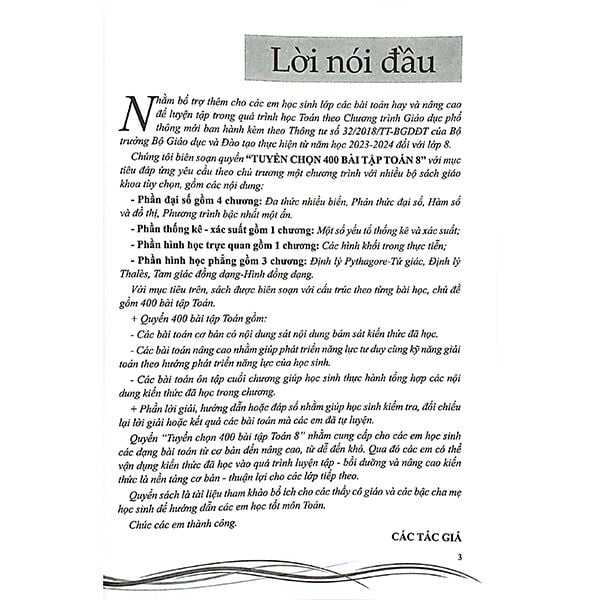 Với mục tiêu trên, sách được biên soạn với cấu trúc theo từng bài học, chủ đề gồm 400 bài tập Toán.