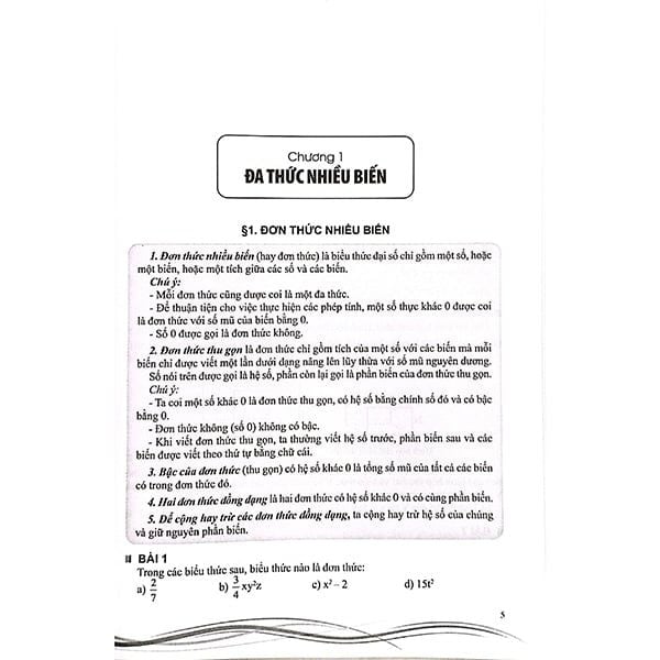 - Phần đại số gồm 4 chương: Đa thức nhiều biển, Phân thức đại số, Hàm số và đồ thị, Phương trình bậc nhất một ẩn.